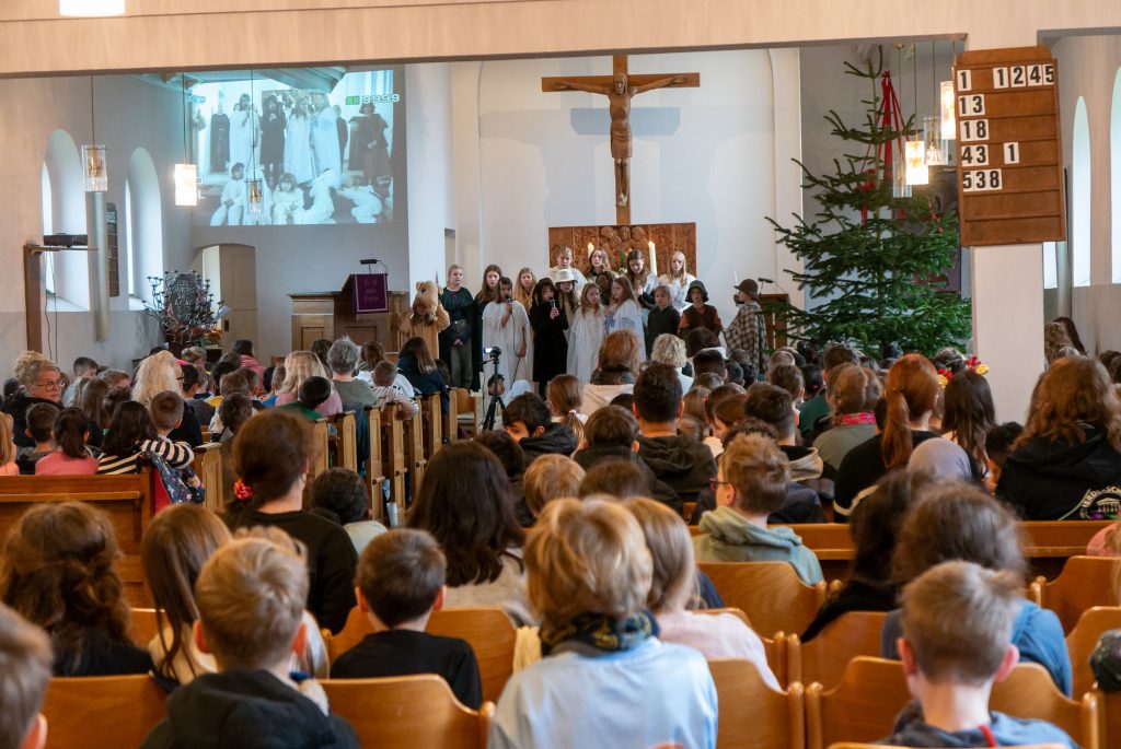 Der Kinder- und Jugendchor der Kirchengemeinde St. Johannes hatte zu einem Kindermusical eingeladen. Samy und das Weihnachtswunder stand auf dem Programm. Die ersten bis vierten Klassen der Herderschule kamen der Einladung gerne nach. Über 200 Schülerinnen und Schüler machten sich auf den Weg, um die Weihnachtsgeschichte in der Kirche in Holzhausen zu erleben. Dabei waren sie nicht nur Zuschauer, sondern auch Akteure, denn sie konnten bekannte Weihnachtslieder mitsingen. Gut 35 Minuten dauerte die Aufführung. Am Ende bedankte sich Regine Hüttmann mit einem kleinen Geschenk bei den Verantwortlichen.