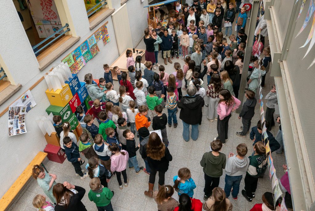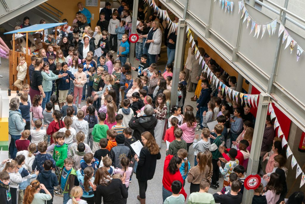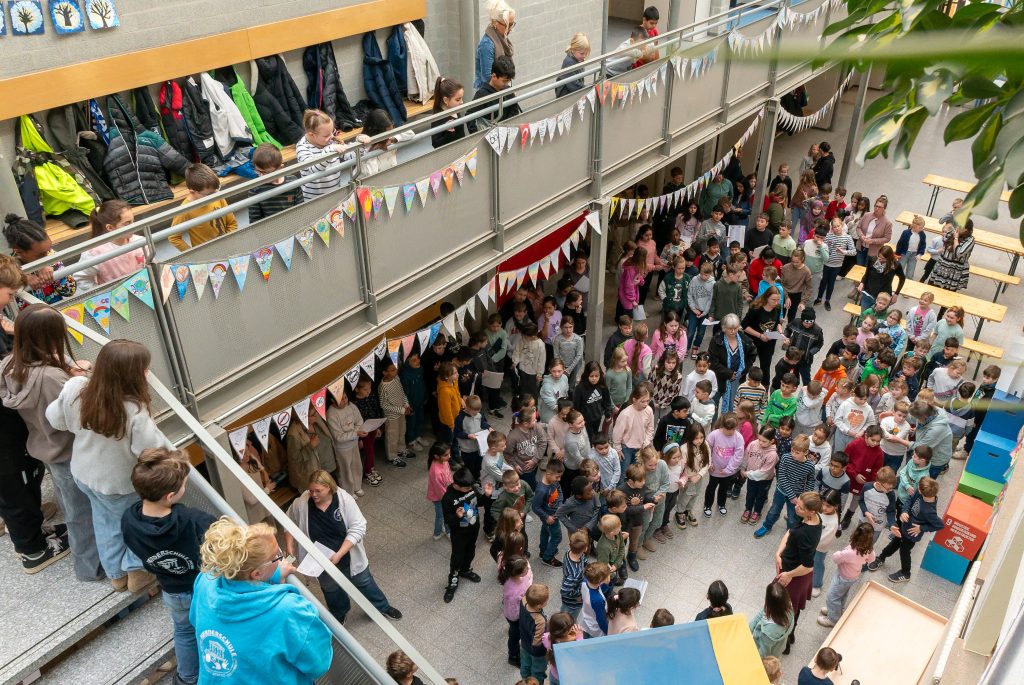Am Montag trafen sich die Grundschulklassen in der Pausenhalle, um den Schulsong zu üben. Unter der Leitung von Musiklehrerin Christina Hilbers sangen die Jungen und Mädchen das Lied und übten gleichzeitig die Bewegungen zum Song. Am Freitag soll das Lied dann aufgenommen werden.