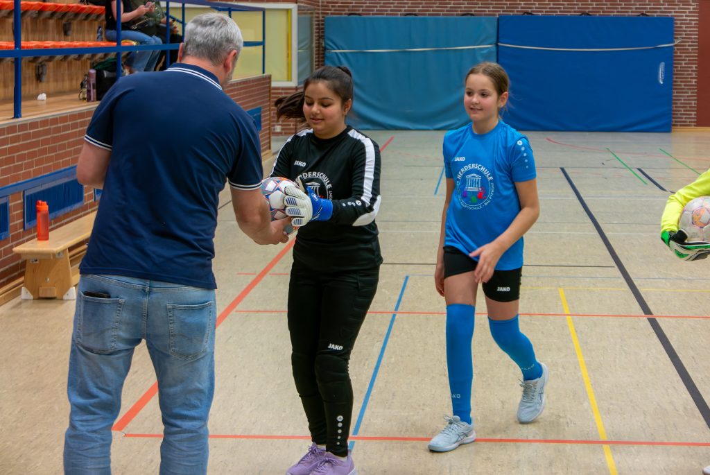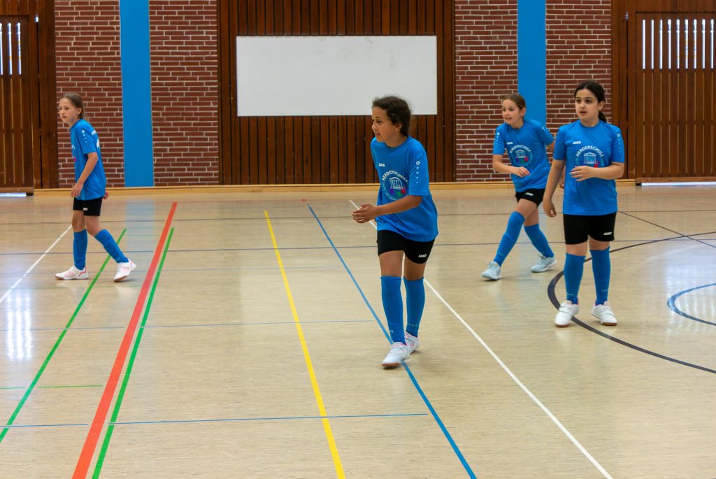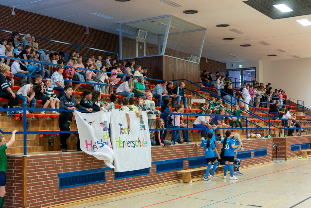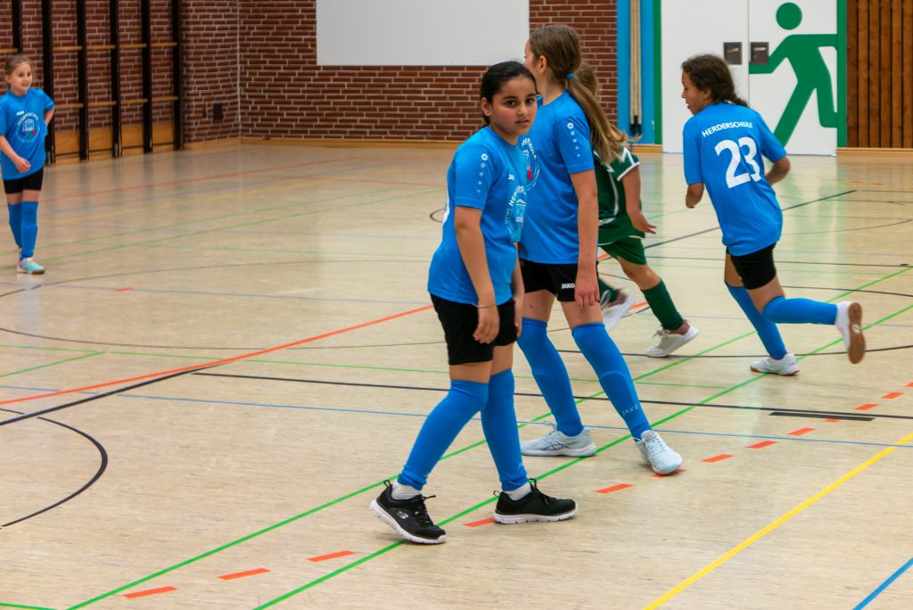 Zum ersten Mal fand ein Fußballturnier nur für Mädchen statt. Die Herderschule hatte dazu die Idee und ihr Interesse an der Ausrichtung dieses Hallenturniers an Malte Fitzner, den Beauftragten Schulfußball, weitergegeben. Nach einer Abfrage kamen fünf Mannschaften zustande. 12 Minuten dauerte jedes Spiel und es wurde nach vereinfachten Regeln gekickt. Die Spielerinnen waren mit Begeisterung dabei, hatten aber teilweise noch Probleme mit dem Regelwerk. Da wurde schon mal nach einem Tor ohne Mittelanstoß weitergespielt, Seitenlinien oder auch die Pfiffe des Schiedsrichters wurden missachet. Positiv fiel hingegen auf, das es praktisch keine Fouls und auch keine „Schwalben“. Das Ganze tat der Spielfreude jedoch keinen Abbruch und auch das Publikum, das aus Klassen der Grundschule bestand, war begeistert. Das Mädchenteam der Herderschule wurde entsprechend angefeuert. Der Schulleiter, Herr Bux-Hoffmann, konnte am Ende der Herderschule zum dritten Platz gratulieren. Ein besonderer Dank geht auch an Melanie Veith, die sich mit ihrem Hauptschulteam um die Verpflegung der Mannschaften kümmerte. Ein Anfang ist gemacht. Bleibt nur zu hoffen, dass es im nächsten Jahr mit einem Hallenturnier für Mädchen weitergeht.