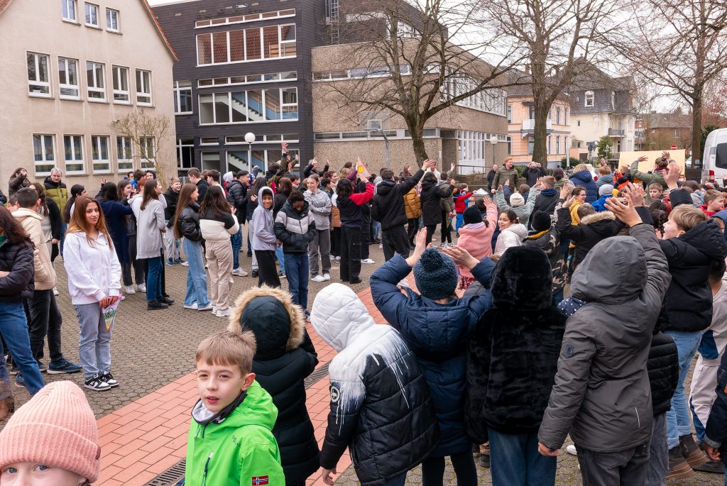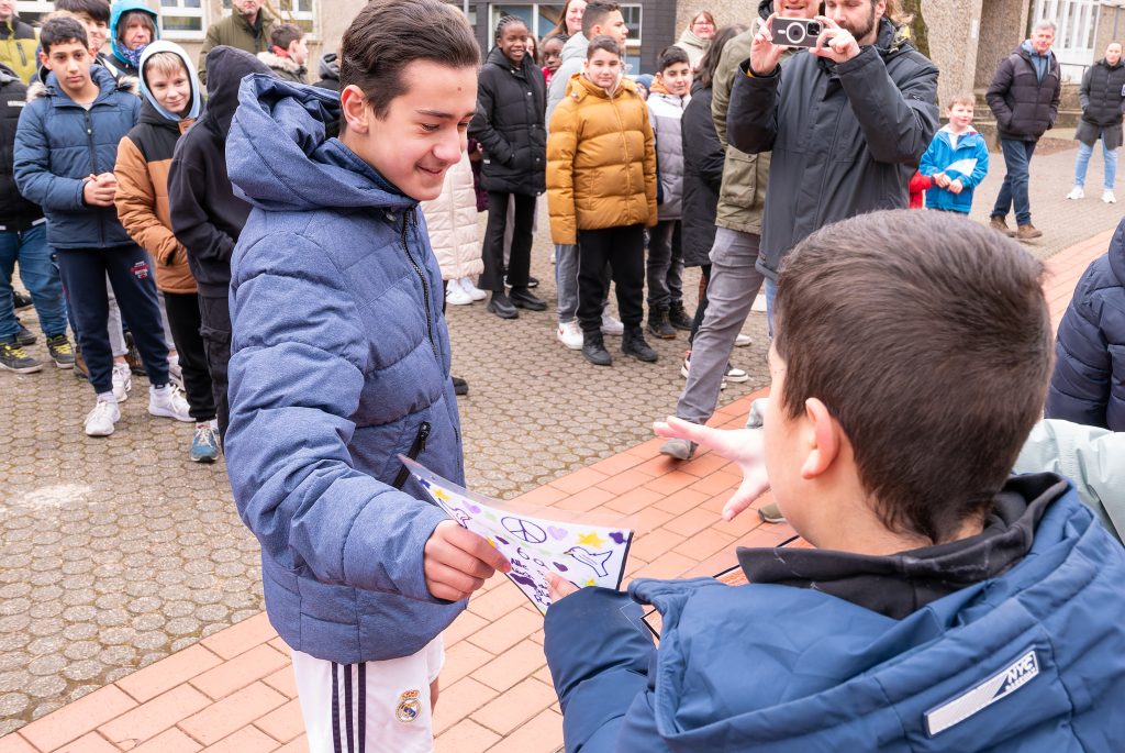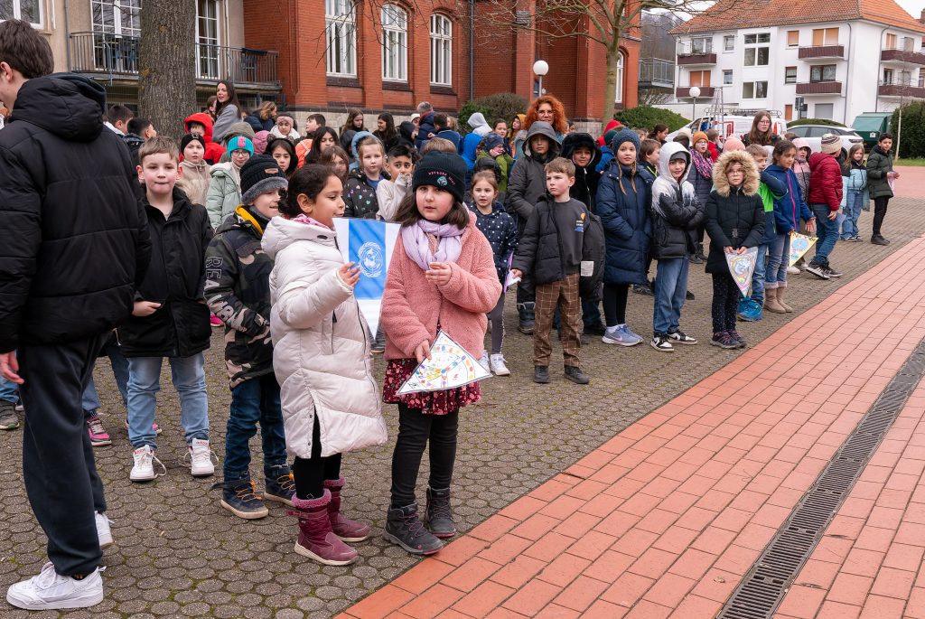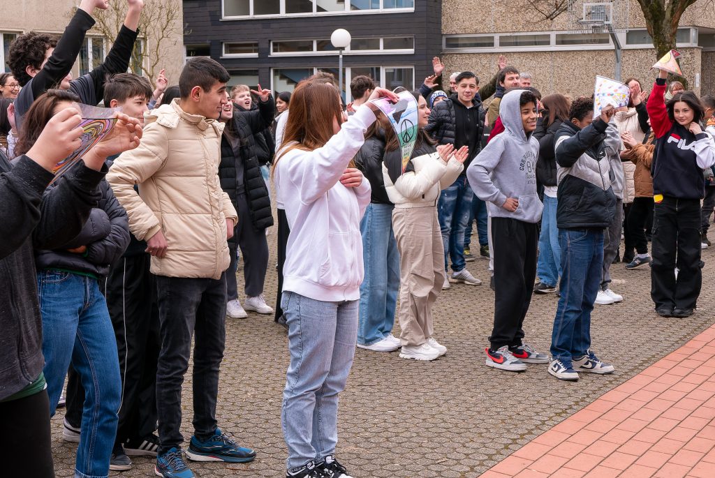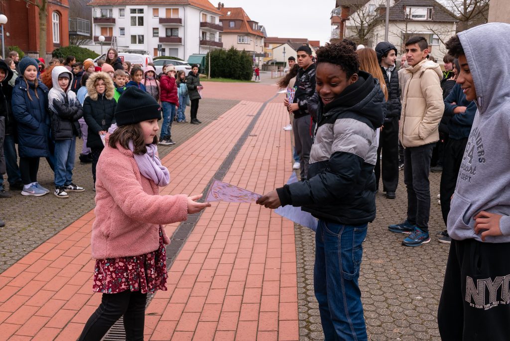 Auf dem Schulhof zwischen der Herderschule und der Realschule trafen sich die ersten bis zehnten Klassen zu einer gemeinsamen Aktion. Im Vorfeld hatten die Klassen Wimpel mit verschiedenen Friedenszeichen hergestellt. Die kleinen Wimpel verblieben in der Klasse oder wurden als Girlande in der Schule aufgehängt. Ein DIN A3-Wimpel kam bei der Aktion zum Einsatz. Die Klassen standen sich gegenüber und tauschten die Wimpel aus.