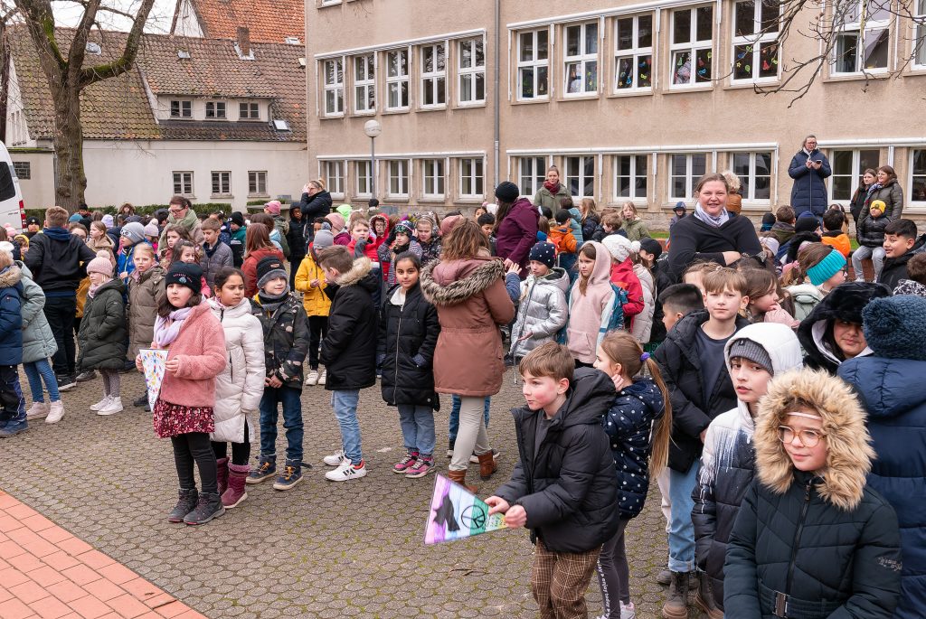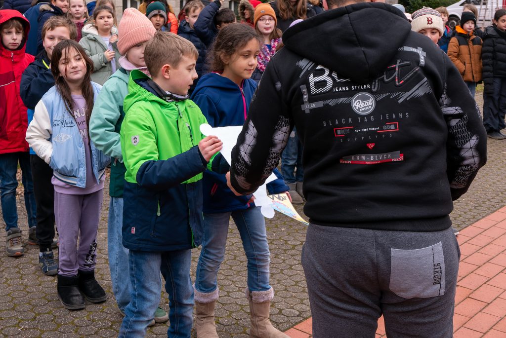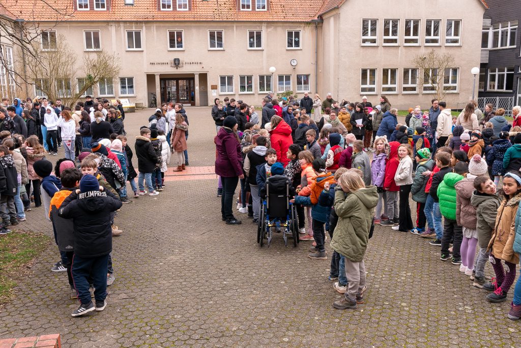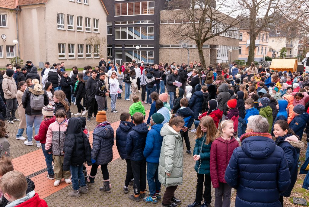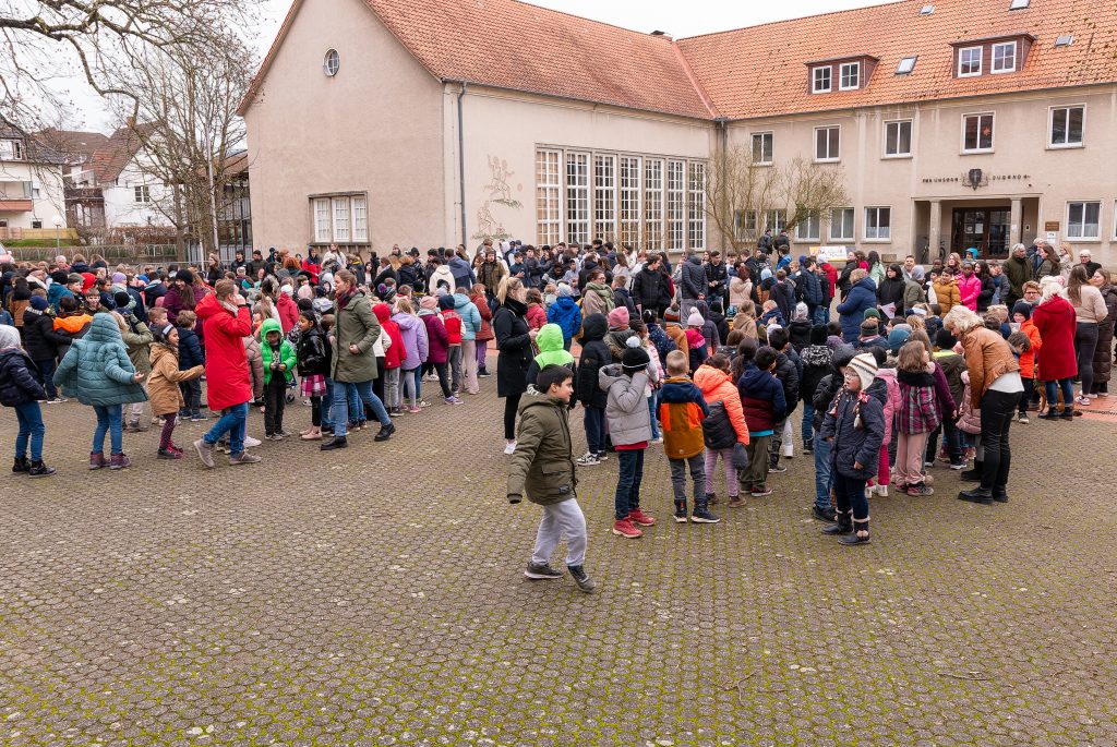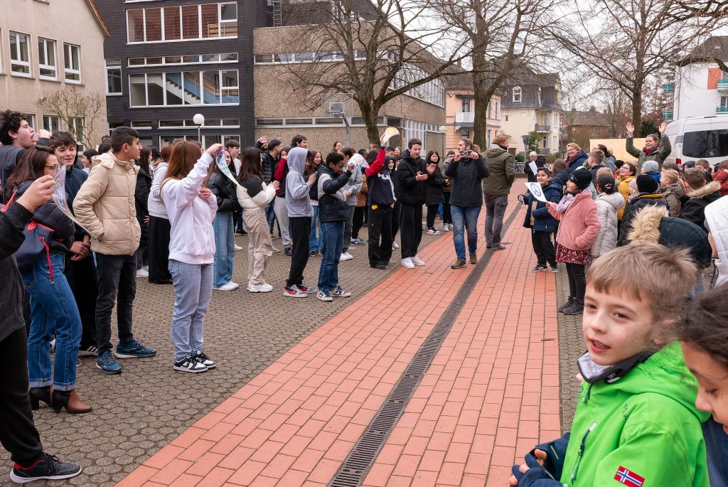 Auf dem Schulhof zwischen der Herderschule und der Realschule trafen sich die ersten bis zehnten Klassen zu einer gemeinsamen Aktion. Im Vorfeld hatten die Klassen Wimpel mit verschiedenen Friedenszeichen hergestellt. Die kleinen Wimpel verblieben in der Klasse oder wurden als Girlande in der Schule aufgehängt. Ein DIN A3-Wimpel kam bei der Aktion zum Einsatz. Die Klassen standen sich gegenüber und tauschten die Wimpel aus.